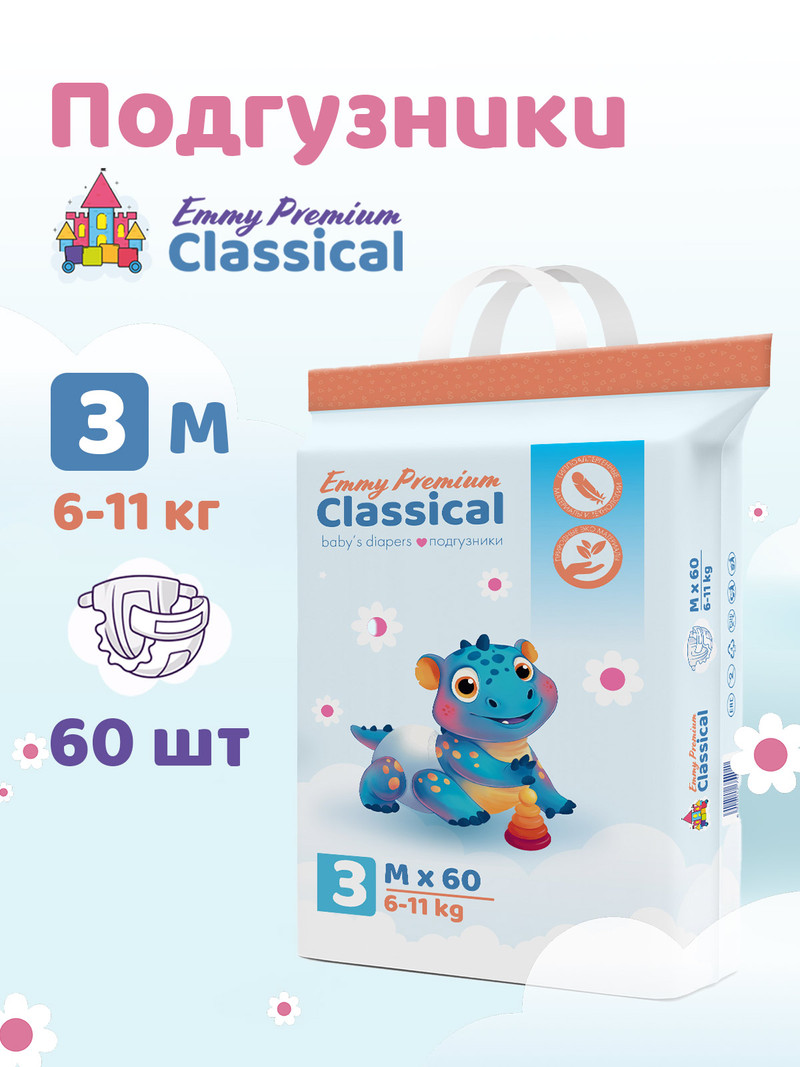 Детские одноразовые подгузники Эмми 3 размера M — забота о комфорте Вашего малыша с первых месяцев жизни! Созданные с учетом анатомии новорожденного и потребностей чувствительной кожи маленьких девочек и мальчиков весом от 6 до 11 кг, они обеспечивают повышенную мягкость и отличную впитываемость.