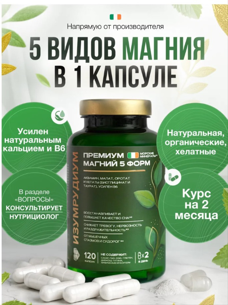 В каждой капсуле — 5 форм магния: бисглицинат, малат, оротат, таурат и морской магний Aquamin, усиленные витамином B6 (пиридоксаль-5-фосфат, в6) для мягкого усвоения без нагрузки на печень. 200 мг (200мг) активного магния в 1 капсуле (400 мл (400мг) в порции) — оптимальная доза для поддержки нервов, сердца, суставов, иммунитета, сосудов, памяти и режима сна.