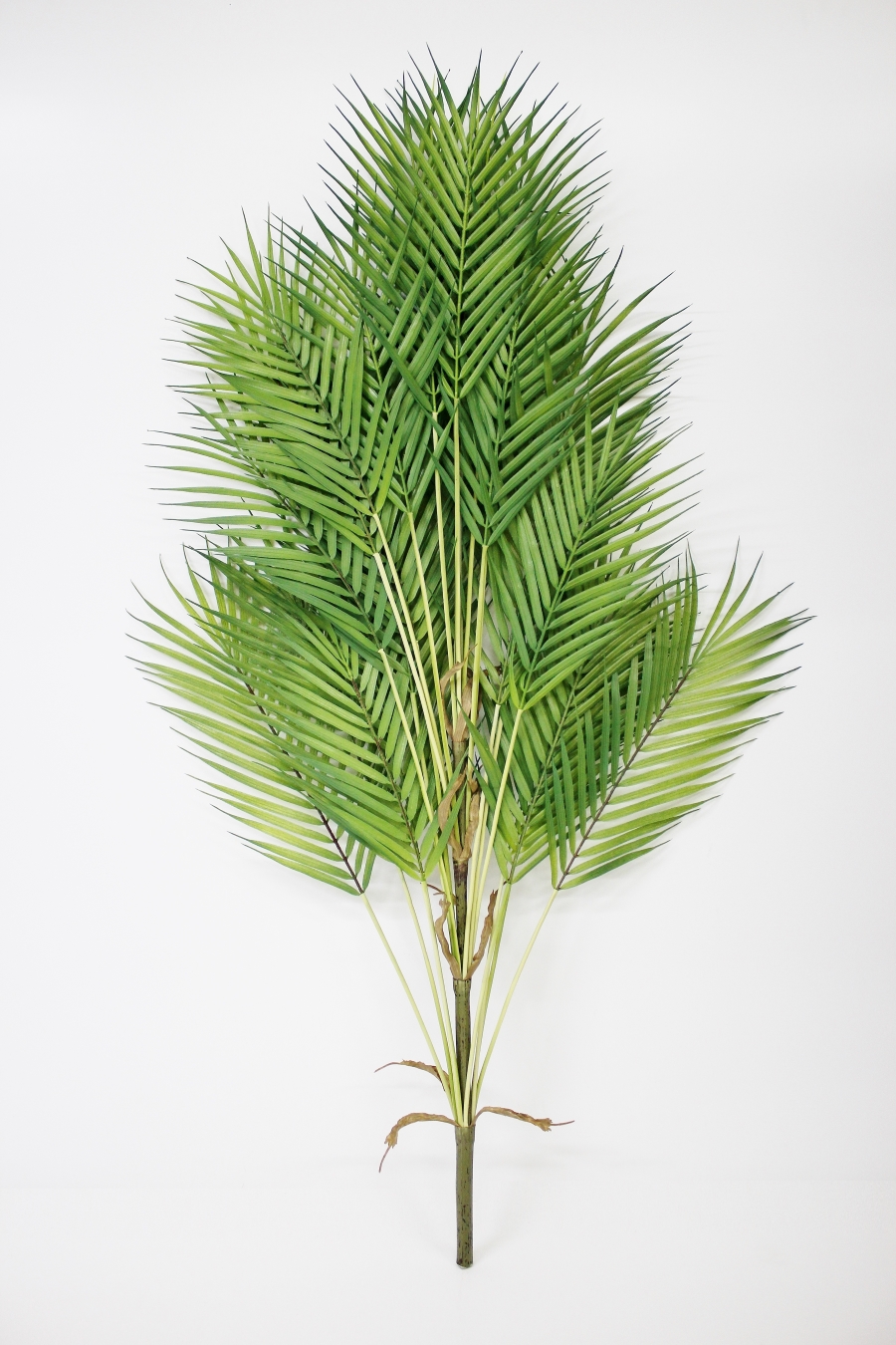 Листья пальмы, используется для декора помещений. Украшение изготовлено из гипоаллергенных материалов (латекс, пластик, металл). Дополнительный уход не требуется. Может применяться на улице. Легко моется и не выгорает от солнечных лучей. Внутри ответвлений проволочная основа, что позволяет растению легко гнуться и не ломаться. 25 ответвлений. Высота в нерасправленном виде 110 см. Ширина около 45 см.
