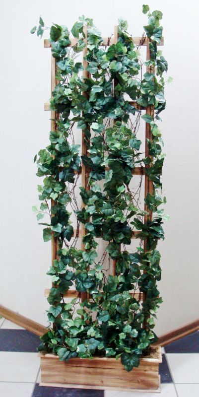 Плющ искусственный на декоративном заборе в деревянном кашпо.