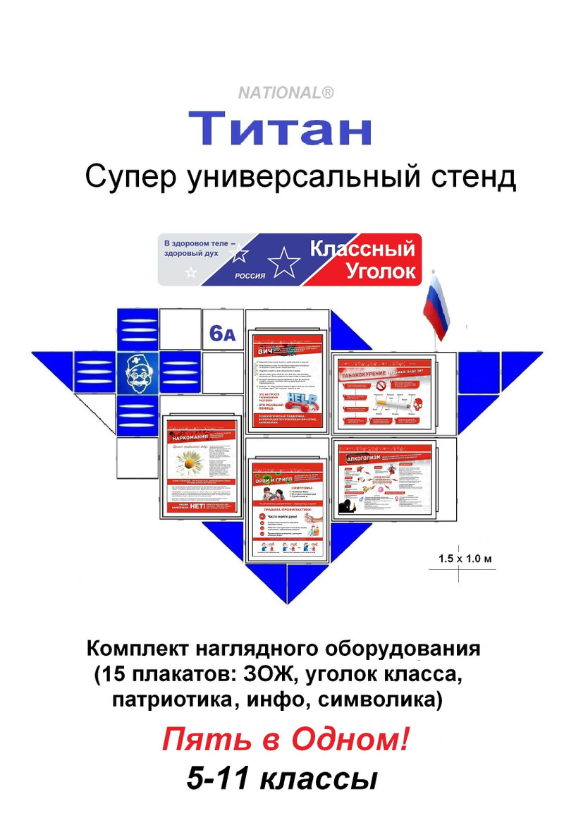 Комплект поставки: — набор элементов стенда “Афина” (“Титан”), крепеж (см. инструкцию сборки) — 1 к-т, — панорамная наклейка 15х75 см “Классный Уголок” - 1 шт, — флажок РФ на стоечке 1 шт, — набор плакатов А4 “Профилактика зависимостей” - 5 листов, — набор плакатов А4 “Уголок класса 5-11 кл” - 5 листов, — разные плакаты (символика России, инфо) — 5 листов, — набор держателей предметов и украшений — 10 ед, — цифры объемные цветные 5,6,7,8,9,1,1,0 — 1 к-т, — литеры объемные цветные А, Б, В, Г, Д — 1 к-т, — коробка картонная упаковочная 38х25,3х19 см — 1 шт, — инструкция сборки и эксплуатации — 1 лист, — сертификат соответствия — 1 лист.