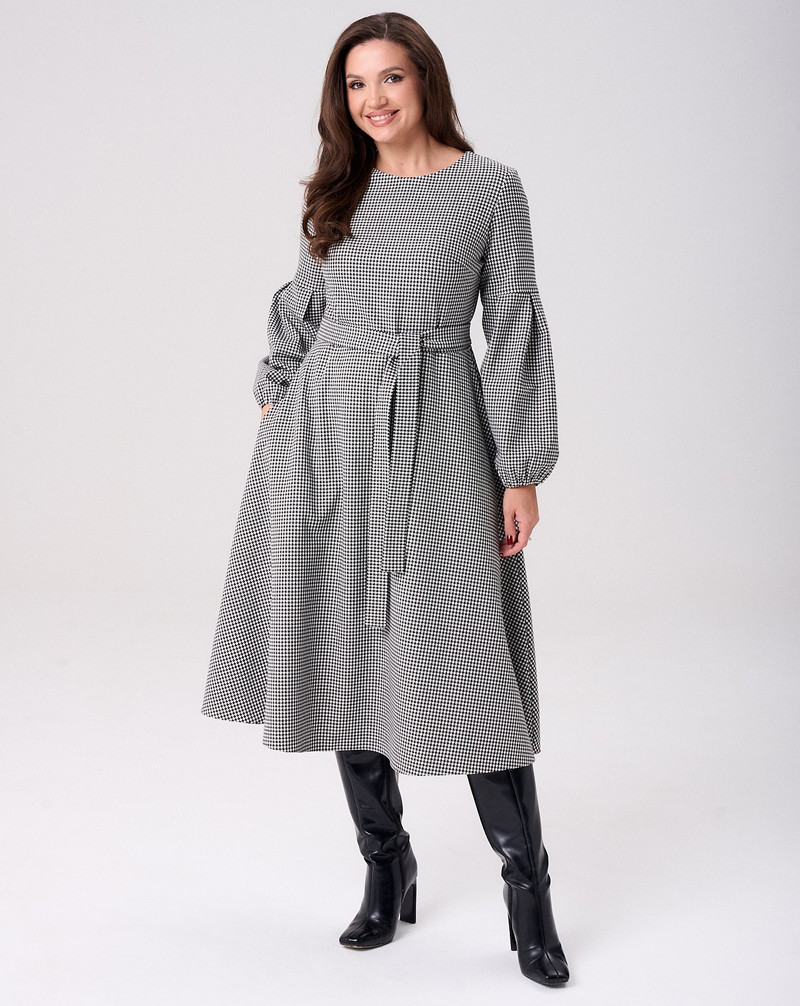 Платье отрезное по линии талии, с расклешенным низом. В боковых швах платья расположены карманы. Горловина округлая. По спинке потайная молния. Рукав втачной с декоративной нижней частью. Низ рукава собран на эластичную тесьму. Длина рукава от плеча для роста 164 см 60 см, для роста 170 см 63 см. Длина платья от лнии талии для роста 164 см 80 см, для роста 170 см83 см. Пояс из основной ткани в комплекте.