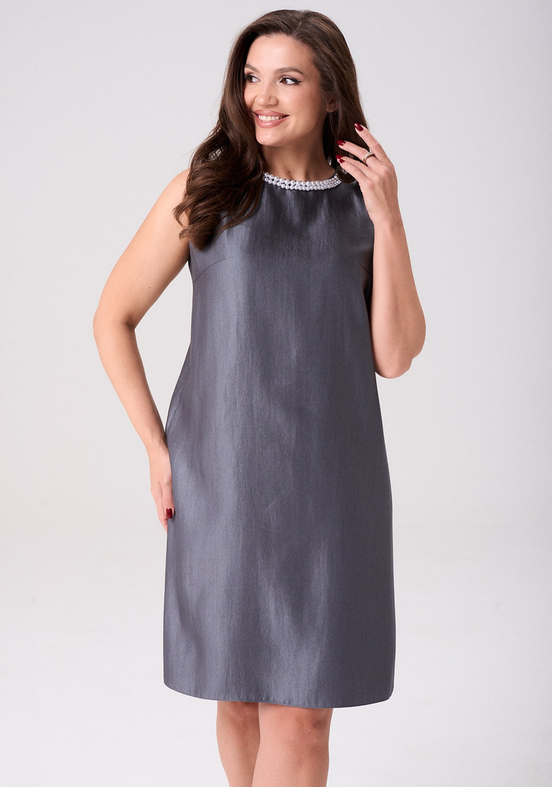 Платье А-силуэта с вытачками на полочке, и потайной молнией сзади, выполнено из кстюмно-плательной ткани, приятной на ощупь, с легким блеском. Горловина округлая, отделана бусинами под жемчуг. Длина платья от плеча по спинке для роста 164 см 93 см, для роста 170 см 95 см.