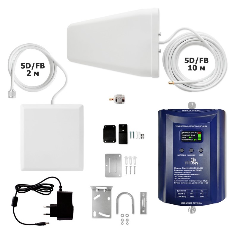 Комплект Titan-900⁄2100 PRO (LED) - одновременное усиление двух диапазонов. Мощность до 200 мВт. Оснащен автоматической регулировкой усиления (до 20 дБ) и ручной(до 15 дБ).