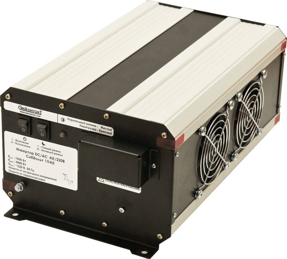 Инвертор СибВольт 1548 Li-ion (преобразователь напряжения) преобразует постоянное напряжение аккумулятора 48В в переменное синусоидальное напряжение 220 В и частотой 50 Гц.