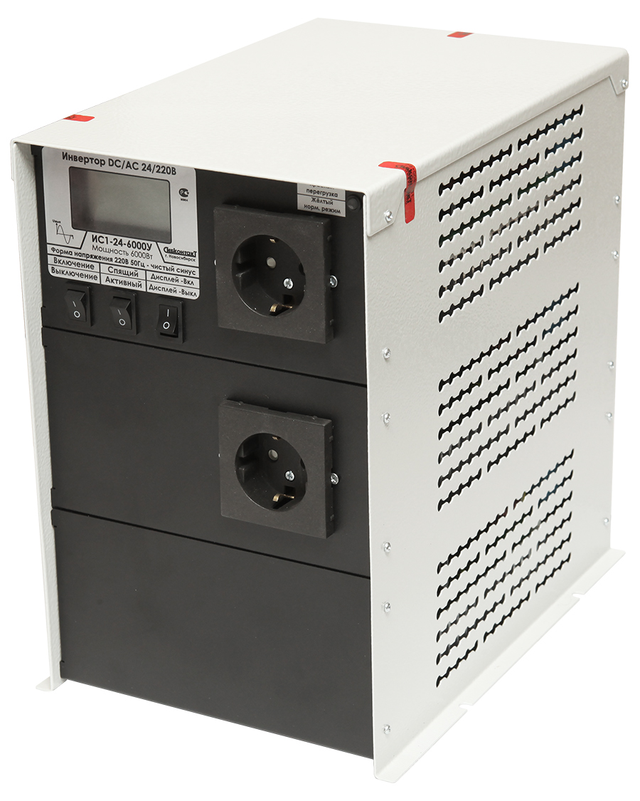 Инвертор ИС1-24-6000 с жидкокристаллическим индикатором (преобразователь напряжения) преобразует постоянное напряжение аккумулятора 24 В в переменное синусоидальное напряжение 220 В и частотой 50 Гц.
