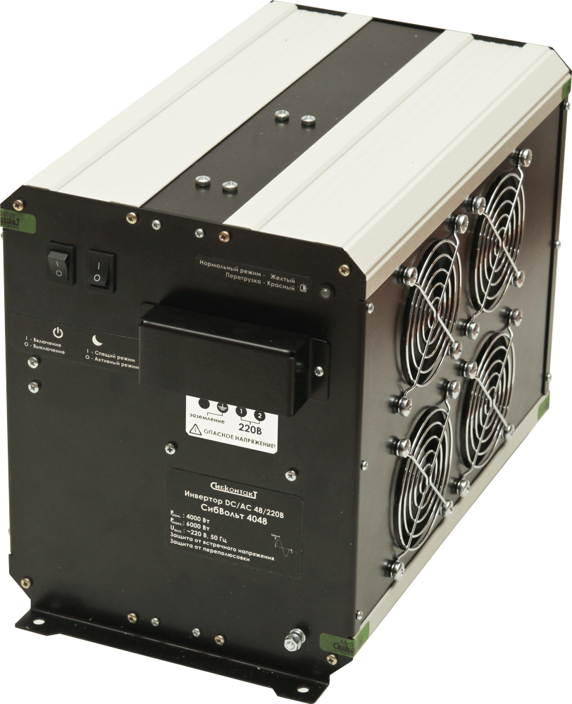 Инвертор СибВольт 4048 Li-ion (преобразователь напряжения) преобразует постоянное напряжение аккумулятора 48В в переменное синусоидальное напряжение 220 В и частотой 50 Гц.