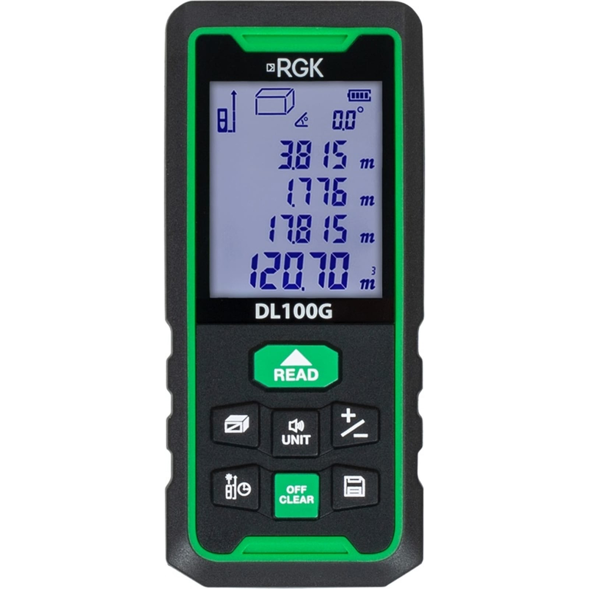 Лазерный дальномер RGK DL100G - зеленый луч гораздо удобнее в работе, чем аналоги с красным излучателем. Точка зеленого цвета с длинной волны 500-535 нм лучше воспринимается человеческим глазом, что позволяет проводить измерения без применения отражательной пластины на бо́льших расстояниях, например, при замерах на улице, или в просторных помещениях - ангарах, складах и т.д.