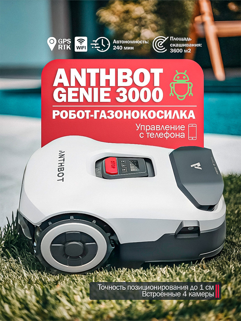 Представьте себе безупречный газон, раскинувшийся на площади целых 3600 квадратных метров — это как три с половиной стандартных футбольных поля! Теперь заботу о таком масштабе доверяют Anthbot Genie 3000 — старшему и самому мощному брату в легендарной линейке. Унаследовав все передовые технологии Genie (точнейшее позиционирование RTK, умное зрение на 4 камерах с ИИ, VSLAM-навигацию), он получил серьезный апгрейд “для больших задач”.