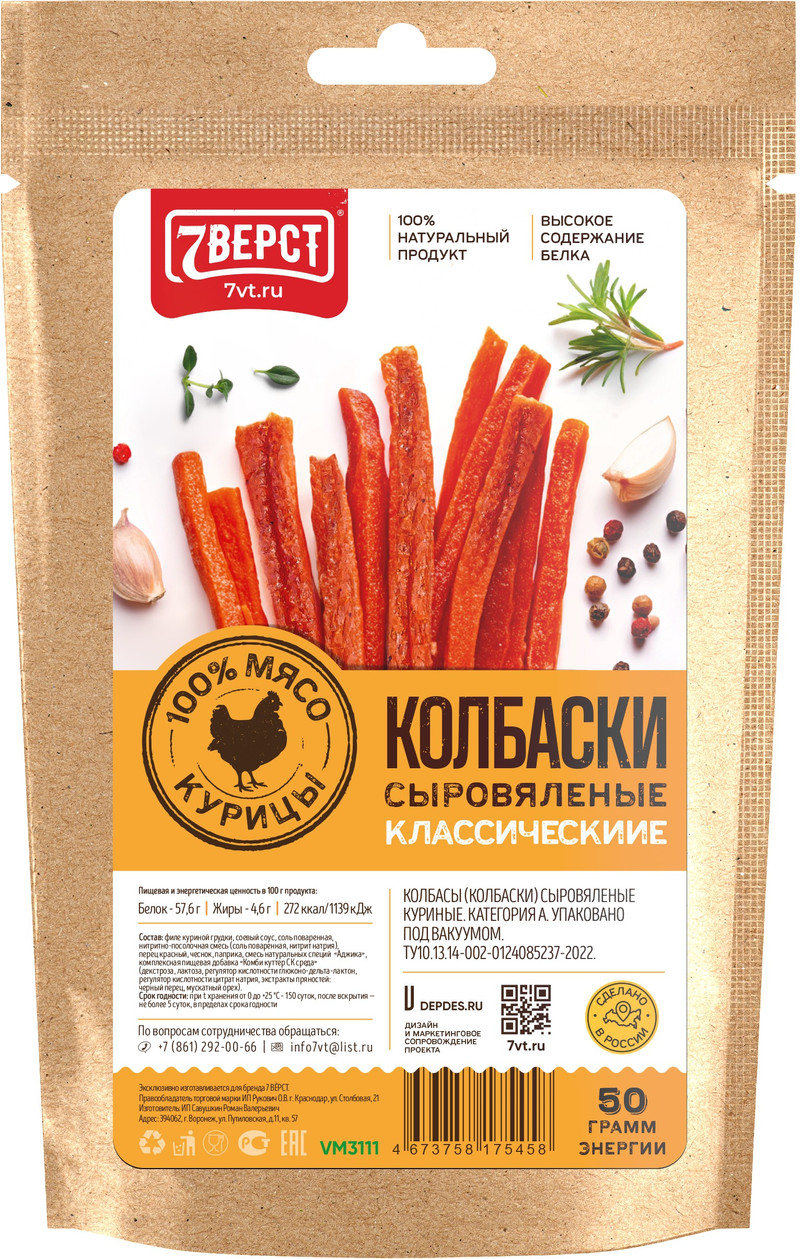 Чтобы купить 7 Верст Колбаски куриные оптом по цене по запросу, свяжитесь с поставщиком. Компания поставщик — 7 вёрст (ИП «Рукович») из города Краснодар (Краснодарский край). Минимальная сумма оптового заказа: 10000 руб. Доставка возможна самовывоз, транспортной компанией, автомобилем, авиатранспортом, железной дорогой, курьером. Способы оплаты: наличными, безналичная оплата, кредитные карты, электронные деньги.