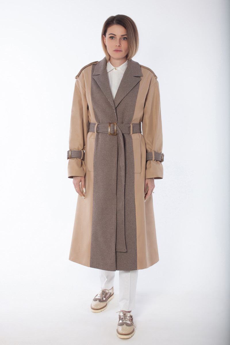 Модель выполнена с поясом и пряжкой на талии, которые помогают подчеркнуть фигуру и создать более женственный силуэт, а в не застегнутом виде делает тренч свободным и парящим, добавляя модели элегантности. Ремешки- регулировщики, находящиеся на рукавах, кроме своей функции затягивать рукав в области запястья для защиты рук от ветра, также являются одной из характерных деталей классического стиля, супатная (потайная) застежка на 4 пуговицы и пряжки, изготовленные под цвет ткани, подчеркивают этот стиль, делая изделие более ярким и выраженным. Небольшая расклешенность по бокам нижней части модели и разрез (шлица) сзади помогают передвигаться в нем легко и свободно.