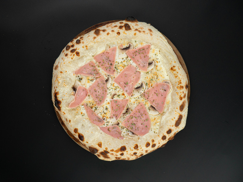 Сыр моцарелла, сливочный соус, ветчина из индейки, шампиньоны, орегано.