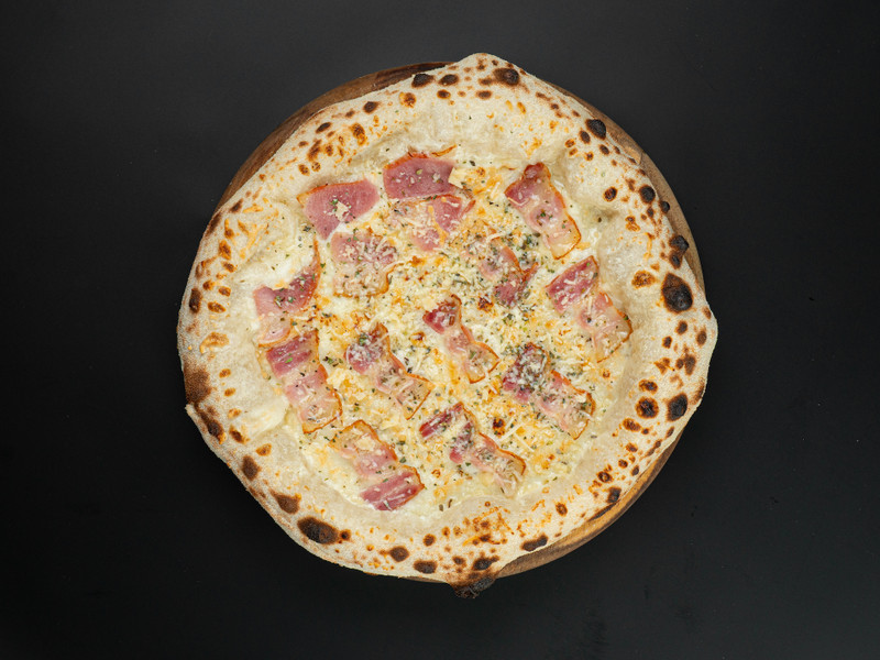 Сыр моцарелла, сливочный соус, бекон, сыр пармезан, орегано.
