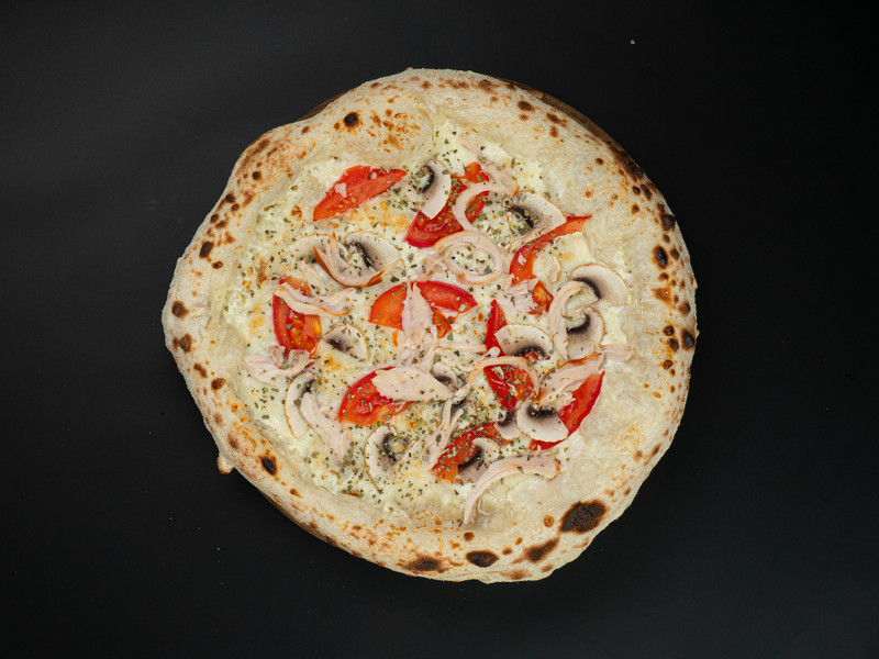 Сыр моцарелла, соус сливочный, ветчина из индейки, шампиньоны.