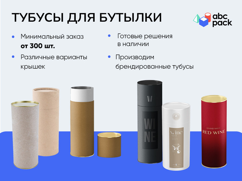 Российское производство. Минимальный заказ от 300 шт. Различные варианты крышек. Возможно производство в обычном крафте или в черном крафте. Тубусы в наличии на складе. Делаем скидки за большие объемы. Под заказ производим брендированные тубусы с вашим дизайном или создаем дизайн с нуля. Брендинг производится с использованием методов тиснения, ламинации или с применением УФ лака. Мы отправляем бесплатные образцы упаковки, чтобы вы могли оценить качество и вместимость пакетов для вашей продукции. Ссылка на сайт: https://abcpack-official.ru/tubus/dlya-butylki/?utm_source=optlist&utm_medium=platform.