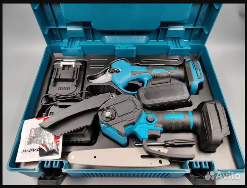 Садовый набор 2 в 1: цепная пила и секатор. Цепная пила имеет шину 15 см (6”). Секатор (сучкорез) предназначен для веток диаметром до 30 мм. Весь инструмент аккумуляторный, поставляется с 2 АКБ и зарядкой. Все идут в кейсе.