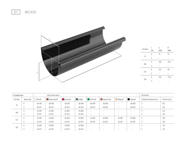 BRYZA предлагает полную систему, состоящую из полукруглых желобов диаметром 75, 100, 125, 150мм, комплекта соединителей и водосточных труб трех диаметров 63, 90, 110. Скромное изящество классических форм, легкость монтажа и гамма из шести цветов в четырех размерах.