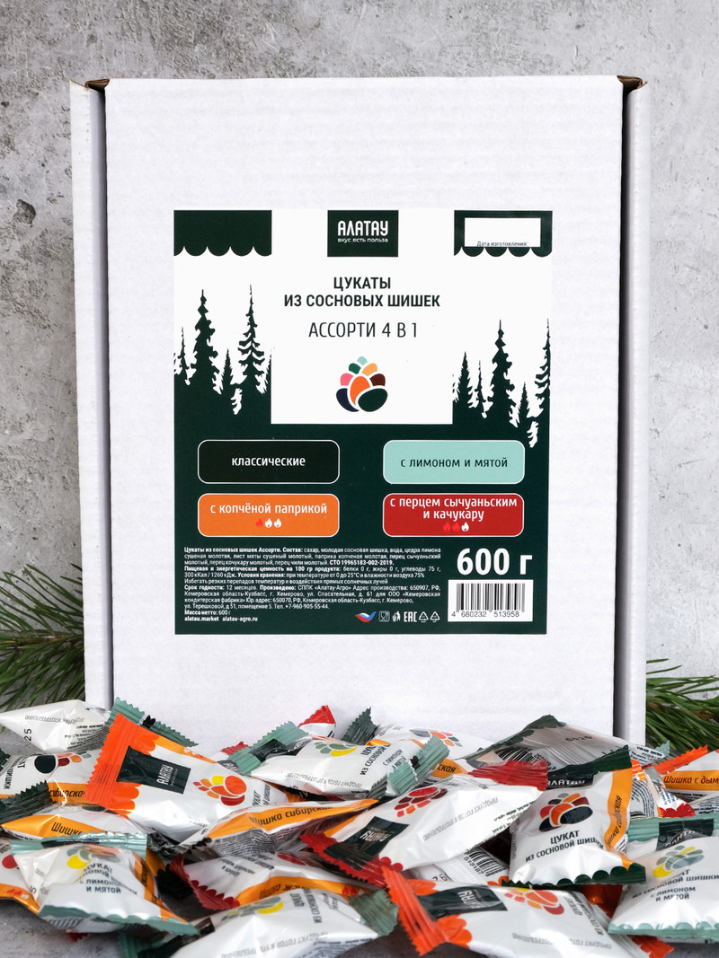 Чтобы купить ЦУКАТЫ сосновые МИКС_КОНФЕТ (600гр):КЛАССИЧЕСКАЯ/ЖГУЧАЯ с сычуаньским перцем/ОСВЕЖАЮЩАЯ с лимоном и мятой/С ДЫМКОМ, с копченой паприкой (цв.ф/п, б/гофра) КА-00003754 оптом по цене по запросу, свяжитесь с поставщиком. Компания поставщик — АЛАТАУ (Алатау-Агро) из города Кемерово (Кемеровская область). Минимальная сумма оптового заказа: 10000 руб. Минимальная партия 1 шт. Доставка возможна самовывоз, транспортной компанией, автомобилем, курьером. Способы оплаты: наличными, безналичная оплата.