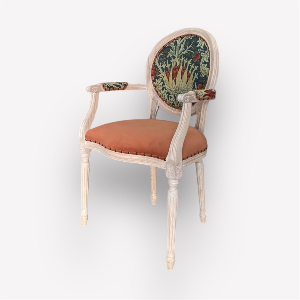 Одним из главных достоинств модели является ее гобеленовая спинка, вдохновленная работами знаменитого дизайнера Уильяма Морриса. Этот художественный элемент придает изделию особый шарм и изысканность. Узоры, выполненные с любовью к деталям, создают атмосферу утонченности и гармонии, привнося в ваш дом дух английской классики.