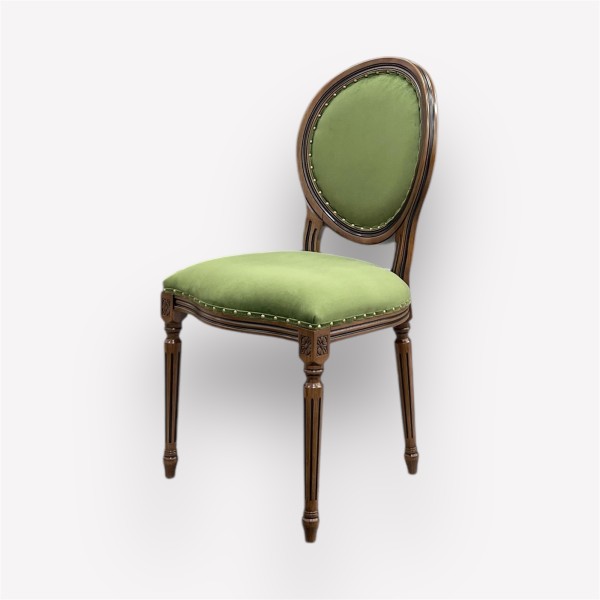Особого внимания заслуживает спинка стула, оформленная декоративным молдингом и украшенная бронзовыми гвоздиками. Эти элементы добавляют изделию благородства и подчеркивают его уникальный дизайн. Окантовка круглой спинки и сиденья выполнена с особым вниманием к деталям, создавая завершенный и гармоничный облик.