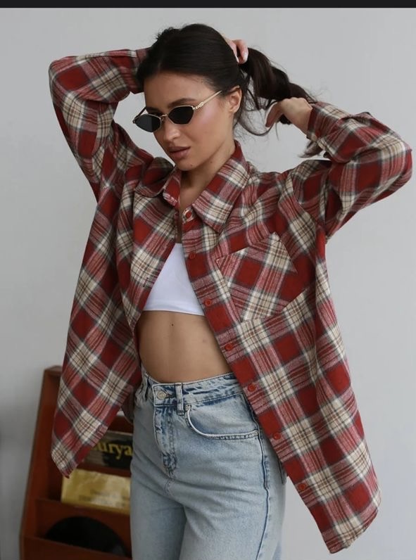 Свободная рубашка в красно-белую клетку из мягкого фланелевого материала. Классический воротник, пуговицы по всей длине и один нагрудный карман. Благодаря прямому крою и уютной ткани отлично подходит для повседневного образа. Можно носить как самостоятельную вещь или накидывать поверх топа или футболки. Идеально сочетается с джинсами и кэжуал-обувью.