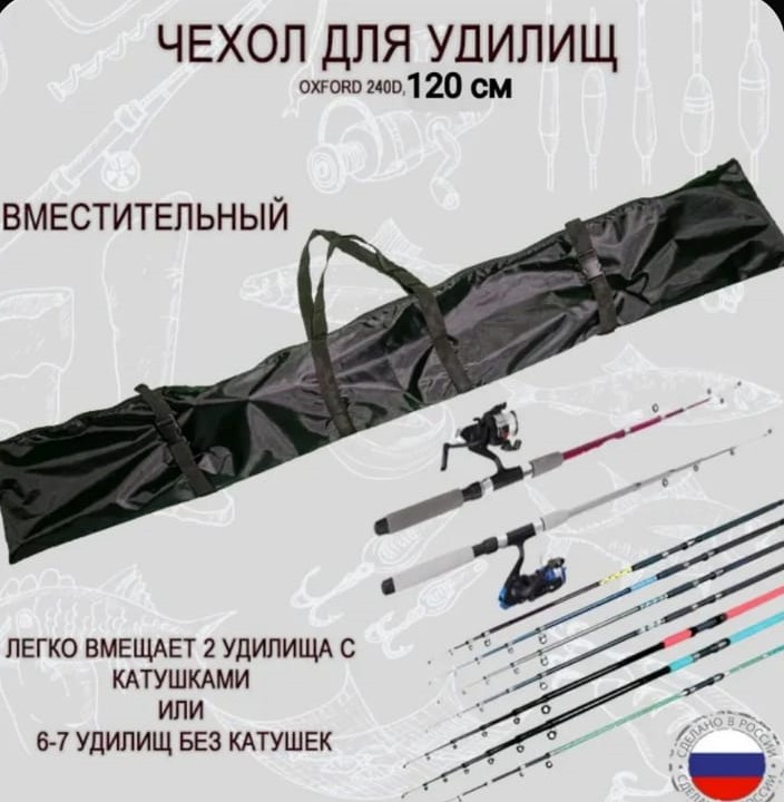 Чехол для удочек 120 см выполнен из высокопрочной водонепроницаемой ткани Оксфорд прошитый армированными нитями. Благодаря своим размерам (длинна 120см; высота 22см) чехол вмещает два удилища с катушками или 6-7 удилищ без катушек. Вес 120 гр.