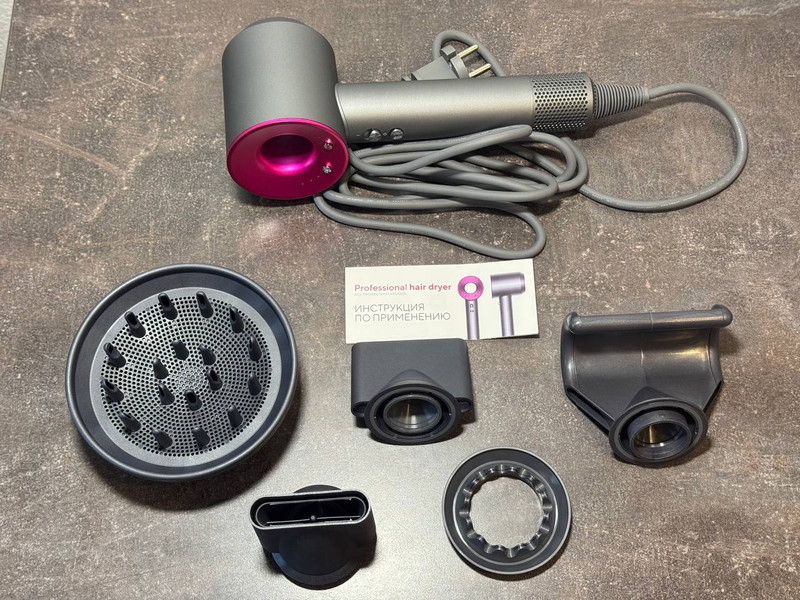Цвет розовый. Надёжные кнопки, без западаний и залипаний. Усиленная плата с повышенной мощностью. Толстый провод 3 метра. Русская инструкция. Держатель на стену в комплекте. Насадки 1 в 1 с оригиналом! Мощные магниты, насадка собирается с болтом, в середине, как у ориги. Лучшее литьё, без заусениц. Каждый фен в дополнительной картонной коробке.