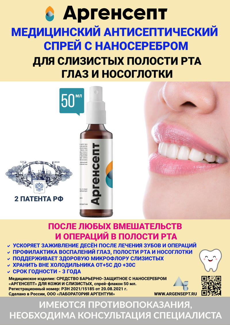 Отсутствие токсичности, доказанное терапевтическое действие наносеребра и его безопасность для человека стало основополагающими факторами для Росздравнадзора Р Ф, который выдал регистрационное удостоверение первому в РФ медицинскому изделию — Средство барьерно-защитное с наносеребром «Аргенсепт», разрешенное для применения в медицине для слизистых и кожи.