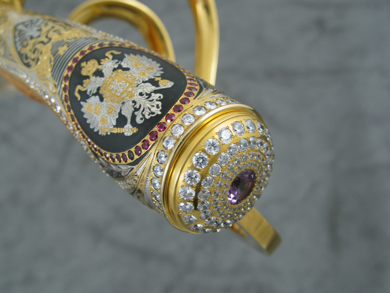 Головка — украшена природным аметистом в обрамлении фианитов. В отделке изделия применены следующие технологические операции: Рисовка, гравировка иглой и резцом,