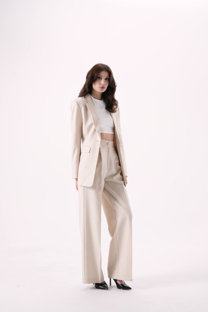 Удлиненный жакет и брюки палаццо с яркими пуговицами.