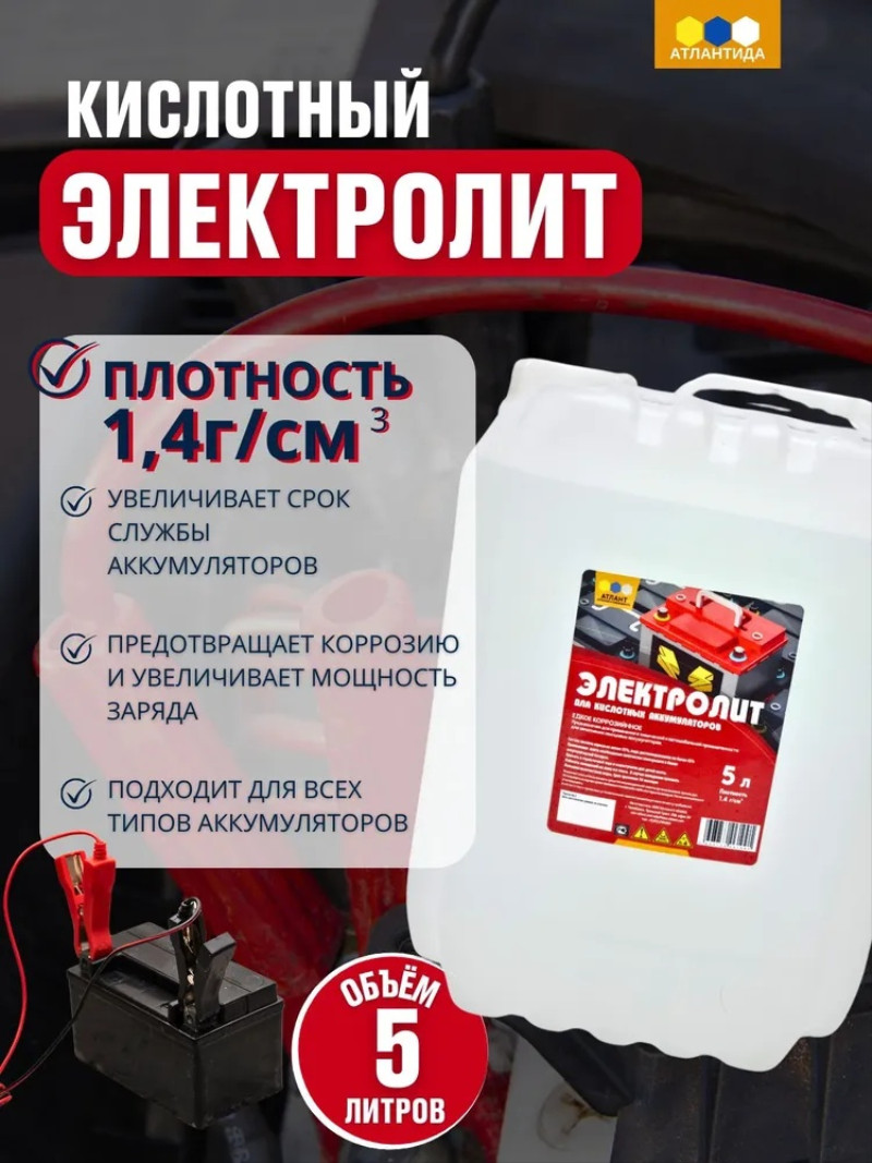 Кислотный электролит ATLANTIDA — готовый к применению раствор серной кислоты, предназначенный для заливки и обслуживания кислотных аккумуляторов всех типов (стартерных, тяговых, стационарных и др.).