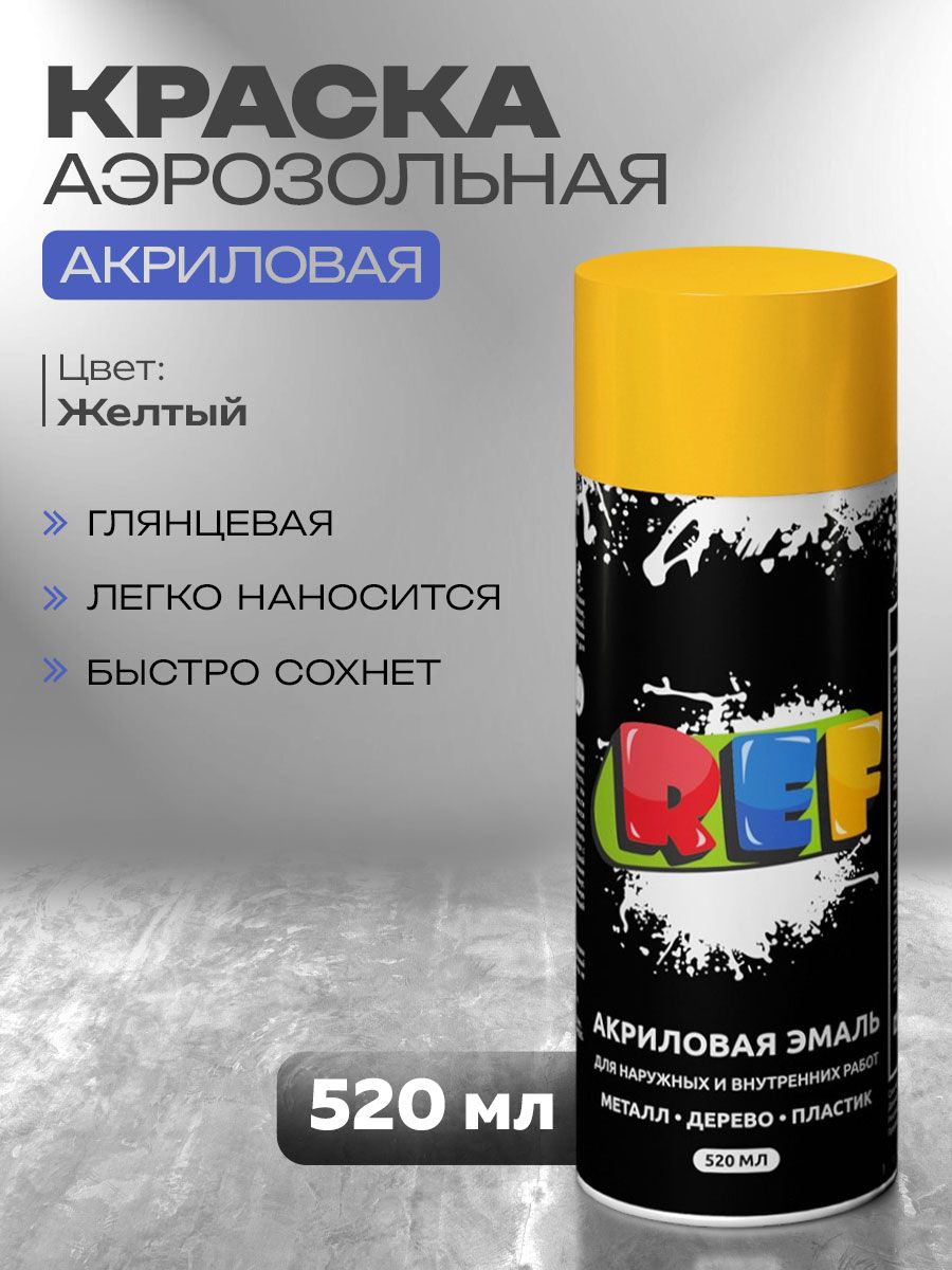 Аэрозольная краска REF — универсальная акриловая эмаль в баллоне объёмом 520 мл. Подходит для окраски дерева, металла, пластика, стекла, стен и мебели. Обладает насыщенным желтым цветом с глянцевым блеском, легко наносится и быстро сохнет. Используется для ремонта, декора, реставрации и других домашних задач. Эмаль устойчива к выцветанию, хорошо ложится даже на старое покрытие. Идеальный выбор для DIY и бытового применения.