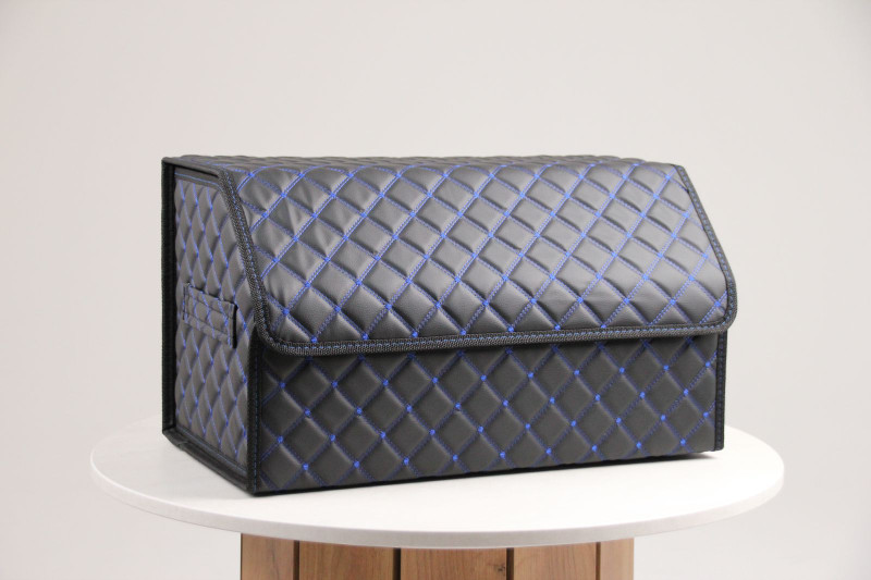 Универсальный и стильный органайзер в багажник автомобиля — один из самых востребованных аксессуаров для авто. Кофр для авто имеет 2 отделения, которые отделены друг от друга перегородкой. Это позволит удобно разместить мелочи, мелкие детали или химию для авто. Складная сумка в авто поможет навести порядок как в салоне, так и в багажнике автомобиля. Качественный материал экокожи гарантирует повышенную износостойкость ящик для хранения, каждый автовладелец оценит функционал ящика, так как органайзер имеет разборную конструкцию, его удобно хранить. Фиксация всех деталей крышки и боковин осуществляется за счет липучек, а уже собранных органайзер легко переносить, т. к по бокам есть вшитые ручки, что облегчает его транспортировку. Благодаря материалу — при легких загрязнениях кофр легко протирается влажной тряпкой или салфеткой. Не занимает много места в багажнике автомобиля, а благодаря лаконичному дизайну подойдет для любого авто будь то иномарка или отечественное авто по типу ВАЗ 2107. Ознакомьтесь со всеми вариантами и цветовыми решениями. Данная сумка — органайзер представлена в черном цвете с рисунком ромб отделанным черной строчкой.