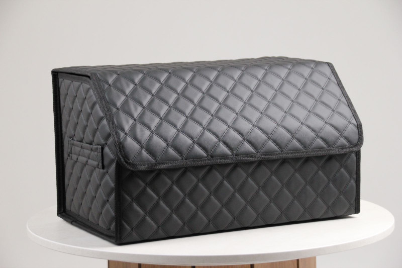 Универсальный и стильный органайзер в багажник автомобиля — один из самых востребованных аксессуаров для авто. Кофр для авто имеет 2 отделения, которые отделены друг от друга перегородкой. Это позволит удобно разместить мелочи, мелкие детали или химию для авто. Складная сумка в авто поможет навести порядок как в салоне, так и в багажнике автомобиля. Качественный материал экокожи гарантирует повышенную износостойкость ящик для хранения, каждый автовладелец оценит функционал ящика, так как органайзер имеет разборную конструкцию, его удобно хранить. Фиксация всех деталей крышки и боковин осуществляется за счет липучек, а уже собранных органайзер легко переносить, т. к по бокам есть вшитые ручки, что облегчает его транспортировку. Благодаря материалу — при легких загрязнениях кофр легко протирается влажной тряпкой или салфеткой. Не занимает много места в багажнике автомобиля, а благодаря лаконичному дизайну подойдет для любого авто будь то иномарка или отечественное авто по типу ВАЗ 2107. Ознакомьтесь со всеми вариантами и цветовыми решениями. Данная сумка — органайзер представлена в черном цвете с рисунком ромб отделанным черной строчкой.