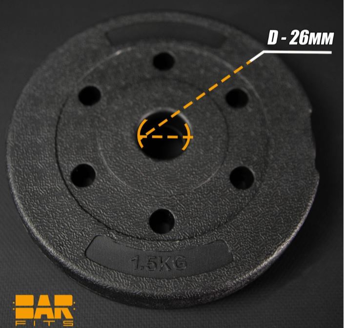 Композитный диск 1,5 кг, корпус сделан из пластика, заполнен бетоном с добавлением металлических шариков для удаления воздушных карманов. Диск устойчив к повреждением и подходит для грифов для гантелей и штанг с посадочным диаметром 26мм.