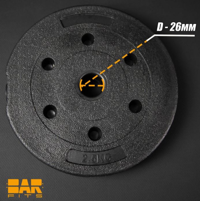 Композитный диск 2,5 кг, корпус сделан из пластика, заполнен бетоном с добавлением металлических шариков для удаления воздушных карманов. Диск устойчив к повреждением и подходит для грифов для гантелей и штанг с посадочным диаметром 26мм.