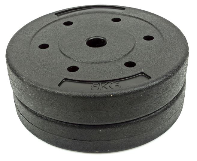 Композитный диск 5 кг, корпус сделан из пластика, заполнен бетоном с добавлением металлических шариков для удаления воздушных карманов. Диск устойчив к повреждением и подходит для грифов для гантелей и штанг с посадочным диаметром 26мм.