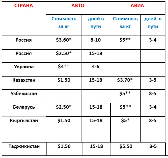 Цены и сроки доставки по странам.