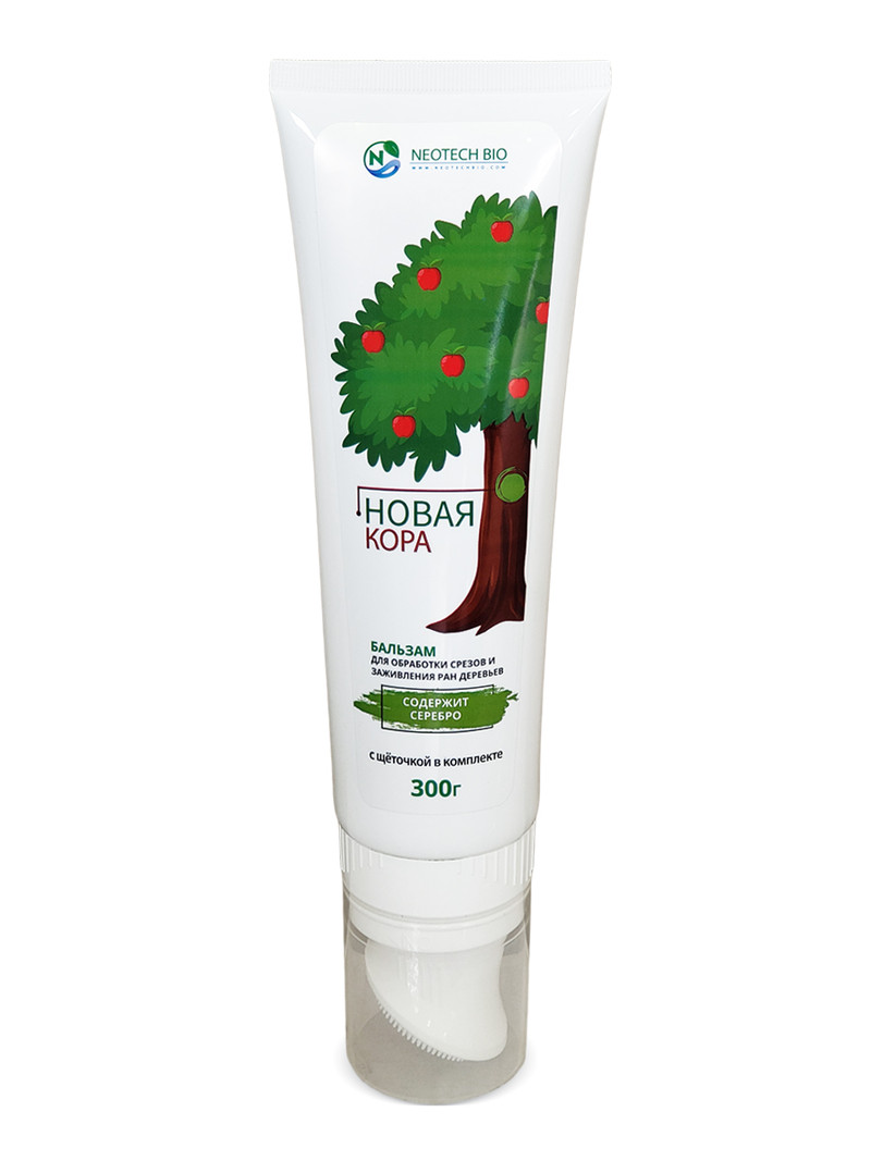 Средство для обработки срезов и заживления ран деревьев НОВАЯ КОРА, туба с щеткой 300 г. — это готовое к применению покрытие. Заживляет раны вызванные обрезкой, солнечными ожогами, морозом и грызунами. Средство образует эластичную пленку, не трескается и не течёт в широком диапазоне температур от -5 до +50С. Применение: Поверните основание щеточки в положение ON (открыто). Перед нанесением важно зачистить рану от отмерших тканей. НОВАЯ КОРА наносится с помощью щеточки сразу после обрезки или образования повреждения на гладкую поверхность раны или обреза. При этом следует нанести средство на 2 см шире самой поверхности раны. Может наноситься круглогодично. Избегать использования во время дождя и при температуре ниже -5С. Не использовать вместе с другими средствами. После использования щетку повернуть в положение OFF и промыть водой. НОВАЯ КОРА по эффективности схож с Laс Balsam Etisso (Искусственной корой для заживления и стерилизации ран деревьев Этиссо).