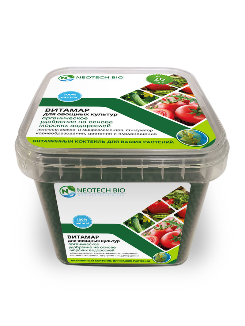 Гранулы ВИТАМАР для Овощных культур на основе экстракта морских водорослей-это уникальное сочетание макро- и микроэлементов, гуминовых, альгиновых и аминокислот для полноценного развития и питания овощных культур.Состав: гуминовые кислоты, аминокислоты, экстракт морских водорослей. NPK азот фосфор калий 15-8-7, содержит микроэлементы в доступной форме: магний, железо, бор, медь, молибден, цинк, серу.Способ внесения: Рекомендуется вносить 3 раза за сезон: в начале вегетации, в период цветения, в период плодоношения. Гранулы распределить на поверхности почвы и взрыхлить почву. После внесения удобрения полить растения.Нормы внесения:Для приготовления рассадной смеси 25-30 г на 5 л. субстрата Внесение в лунку перед посадкой рассады 8-10 г на растение Внесение в междурядья 40-50 г на кв.м. Мерная ложка 8 г. Хранить при температуре от 0 до +40С.