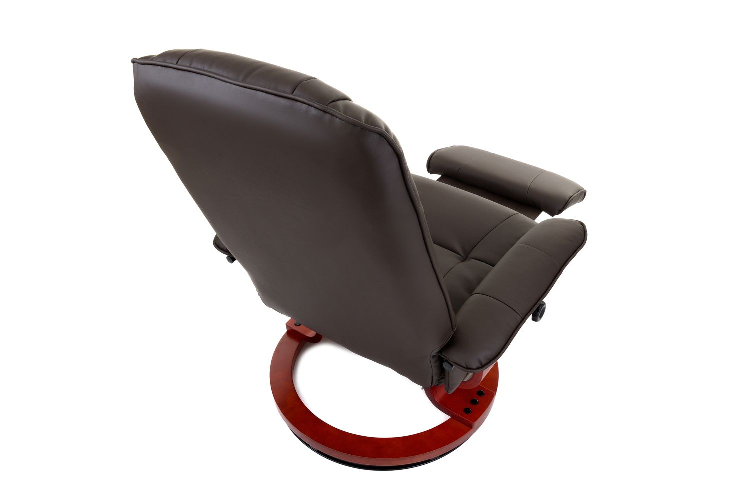 Сделано эко кожи, которая превосходит по своим характеристикам натуральную (более износоустойчива). Вращающееся сиденье. Цвет экокожи: коричневый. Цвет дерева: красное дерево. Питается от сети 230 В с помощью адаптера переменного тока. Пульт управления: есть.Размеры: