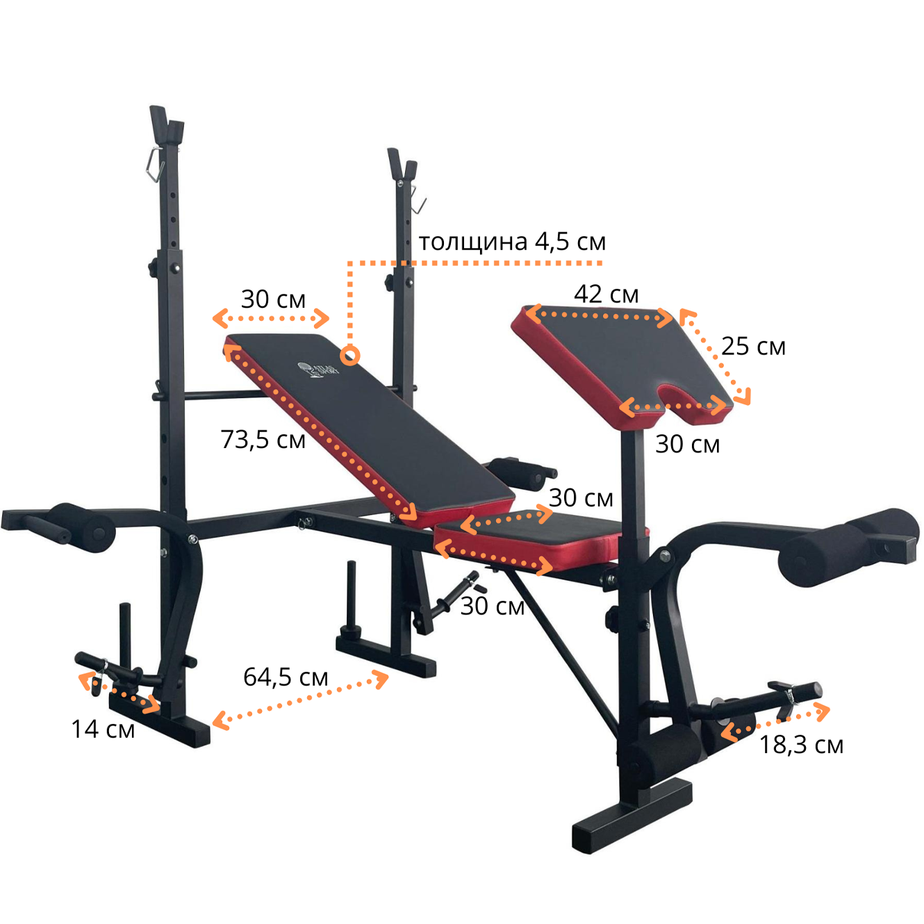 Предназначена для выполнения различных упражнений: жим штанги лежа, парта для бицепса, жим ногами.