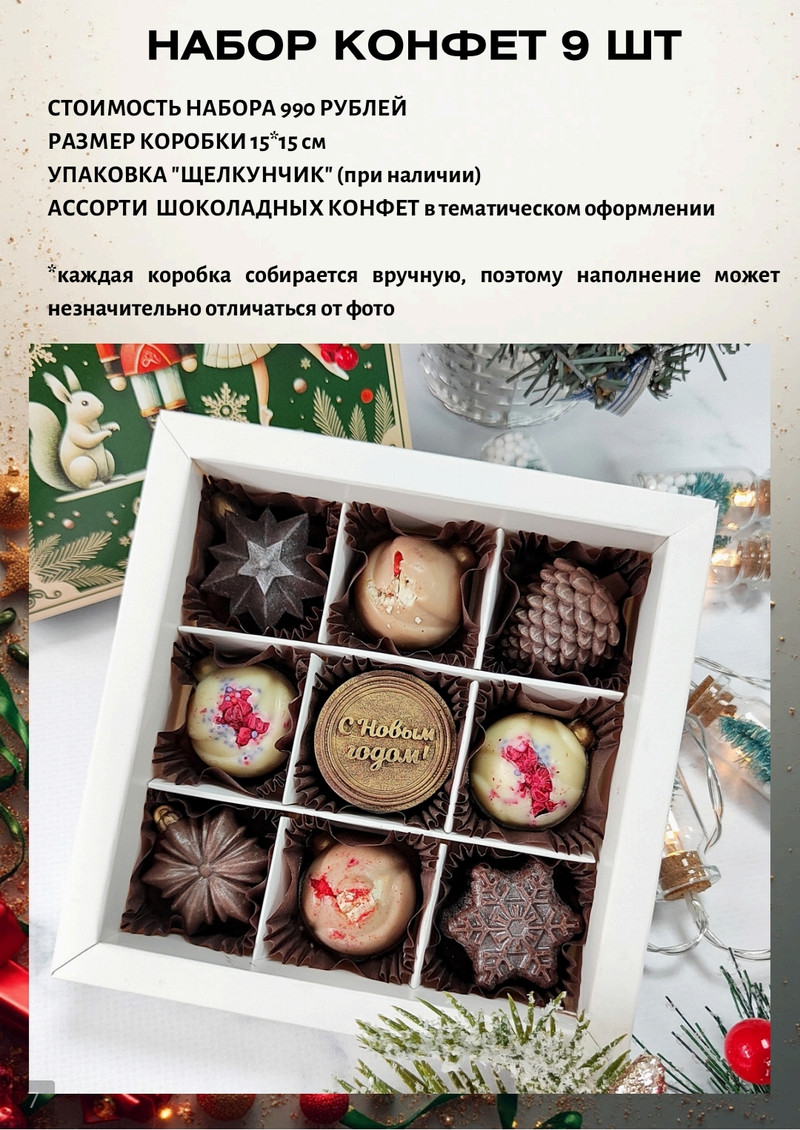 Чтобы купить Набор шоколадных конфет Новогодний Choco cheese nsk оптом по цене 990 руб., свяжитесь с поставщиком. Компания поставщик — Choco cheese nsk (ИП «Ахтулова Анастасия Сергеевна») из города Новосибирск (Новосибирская область). Минимальная партия 10 шт. Доставка возможна самовывоз, автомобилем, курьером, транспортной компанией.