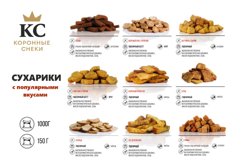 Изготовленные из свежевыпеченного хлеба, только с натуральными специями и ароматными добавками, которые распределяются по поверхности обжаренного хлеба равномерно. Различных видов нарезок: кубик, чипсы, палочки, круг.