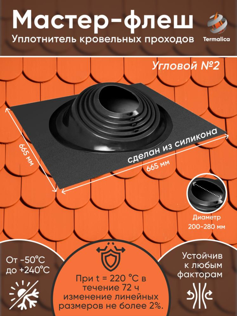 Чтобы купить Проходка кровельная (кровельный уплотнитель) манжета для дымохода Мастер флеш с БОЛЬШИМ ОСНОВАНИЕМ угловой №2, силикон 200-280м оптом по цене 1890 руб., свяжитесь с поставщиком. Компания поставщик — Термалика (ООО «Висол опт») из города Красноярск (Красноярский край). Минимальная сумма оптового заказа: 50000 руб. Минимальная партия 5 шт. Доставка возможна самовывоз, транспортной компанией, авиатранспортом, железной дорогой.