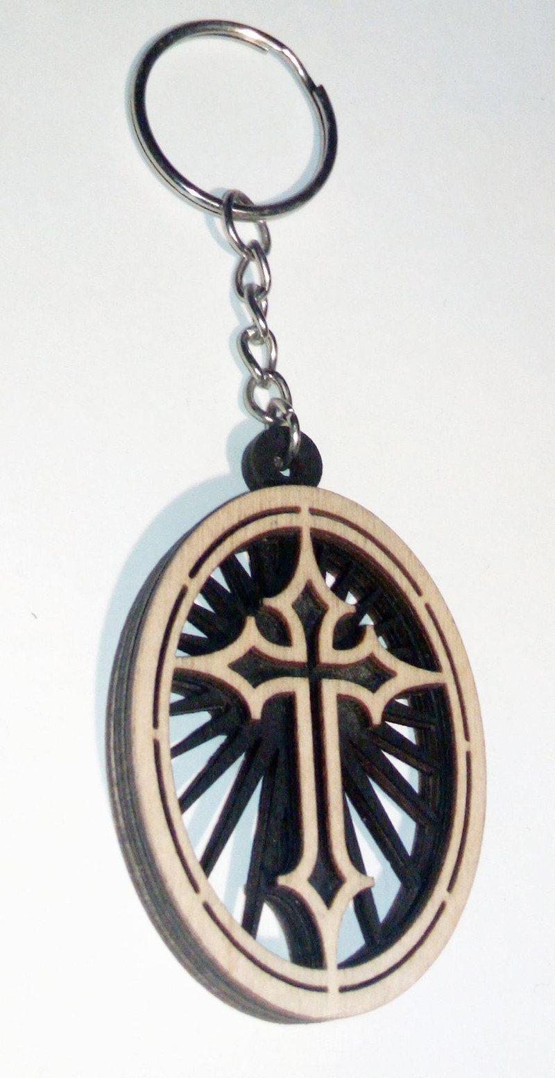 Деревянный двухсторонний брелок состоит из трех слоев березовой фанеры, между которыми есть вырезанный узор, состоящий из креста в центре, окруженного лучами, расходящимися от центра к краю круга.