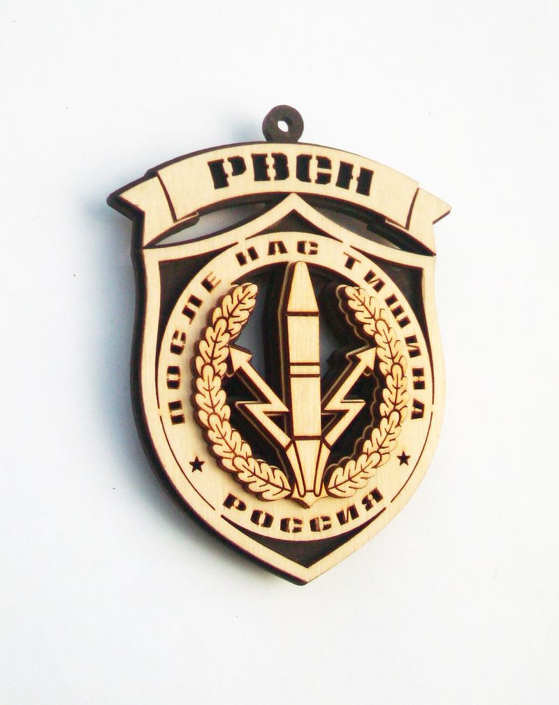 Это эмблема РВСН выполненная в виде двухсторонней подвески из пяти слоев березовой фанеры, что придает объем и прочность.