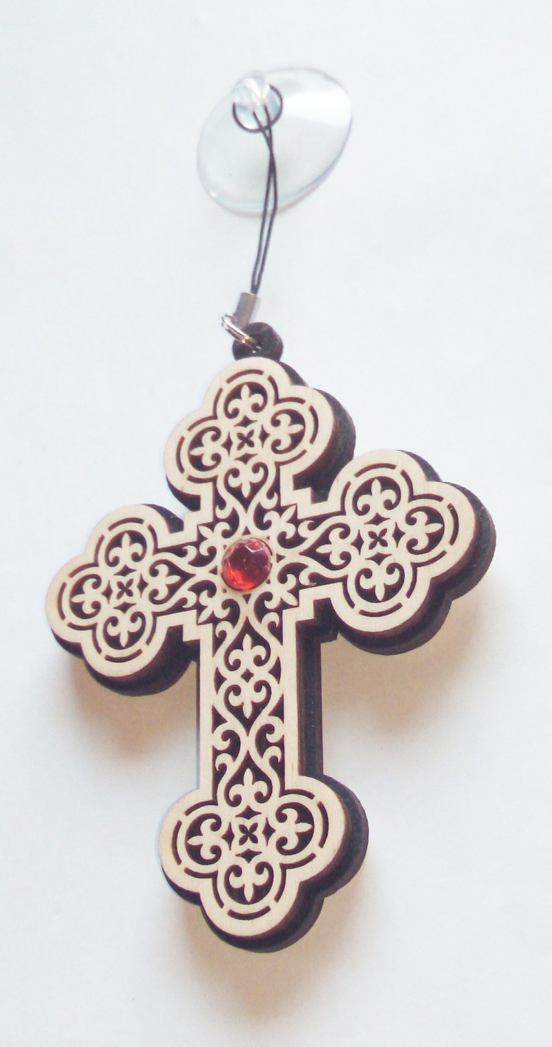 Крест двухсторонний имеет сложную резьбу из трех слоев березовой фанеры, состоящую из повторяющихся элементов, напоминающих стилизованные трилистники и кресты. В центре креста расположен небольшой красный камень, который контрастирует с цветом дерева. В верхней части креста имеется небольшое кольцо, предназначенное для подвешивания.