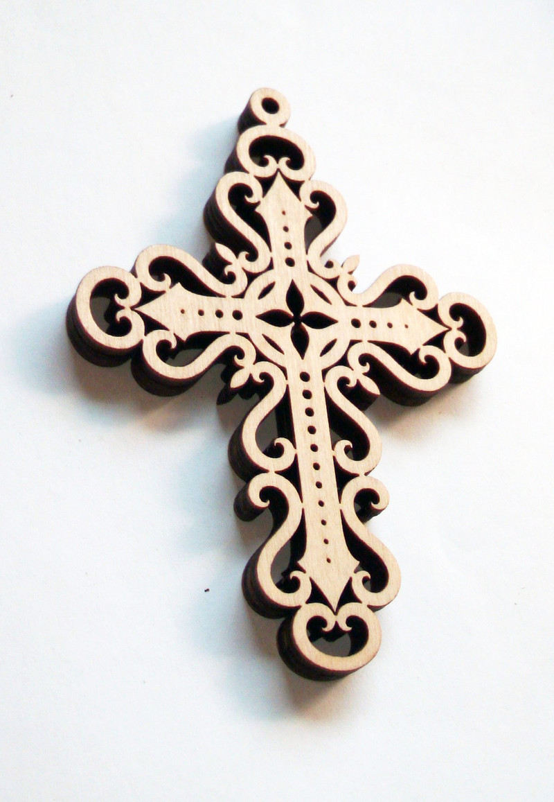 Двухсторонний крест подвеска в машину на присоске, вырезан из березовой фанеры в два слоя. В центре креста находится орнамент в виде четырехлистника. Вдоль вертикальной оси креста располагается ряд маленьких круглых отверстий. Форма креста украшена завитками и другими декоративными элементами.