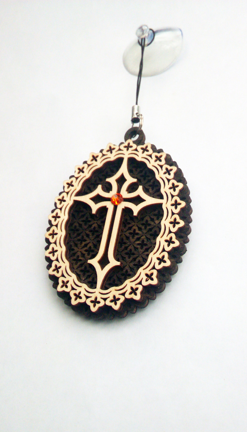 В центре изделия расположен крест более светлого дерева, почти кремового цвета. Крест имеет расширяющиеся концы. В месте пересечения его перекладин вставлен небольшой оранжевый камень.